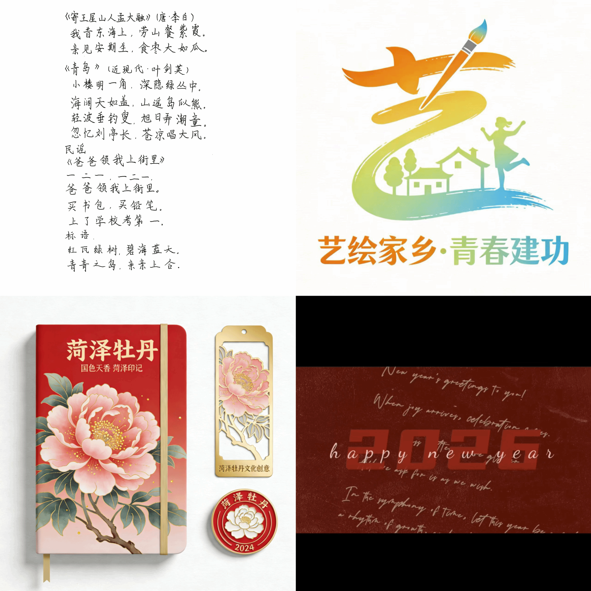 其他同学的优秀作品,包括文字创作、绘画、书法以及视频等形式,将艺术创作与实践服务相结合,把青春力量融入家乡建设,展现家乡发展新貌。