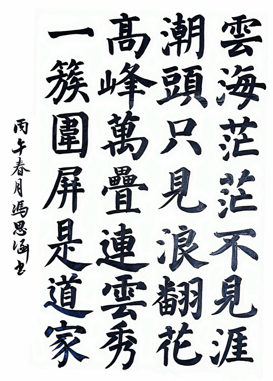 2024级书法一班冯思涵书写的是丘处机描写崂山太清宫的七言绝句。书体采用楷书,取法唐楷,笔画厚重饱满,结体方正端稳,意在以庄重端雅之笔墨,摹写崂山云海浩渺、道风清逸之境,尽显齐鲁文脉与道家哲思。