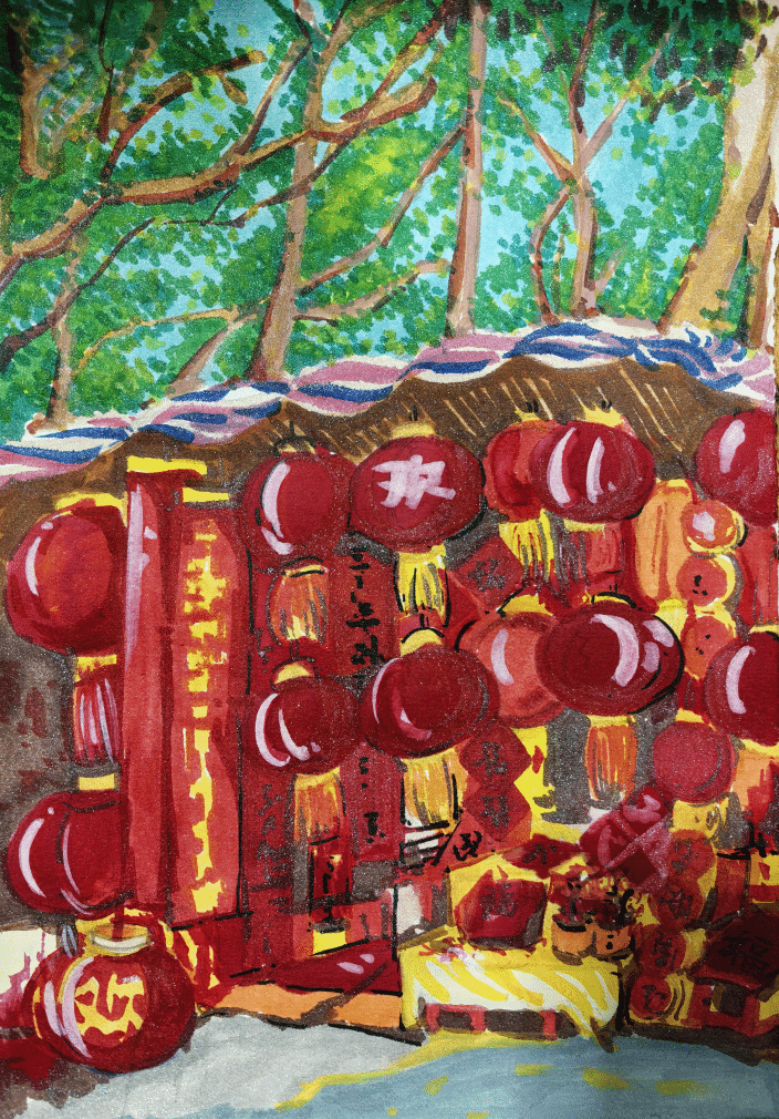 2024级视觉传达四班赵心语这幅作品以家乡春节为灵感,用浓烈的红色灯笼群与环境背景形成对比,密集的红灯笼承载着欢欢喜喜的新春祈愿,既还原了过年热闹的民俗场景,又通过色彩与符号传递出家乡的烟火气与文化温度,是对家乡年俗文化的表达。