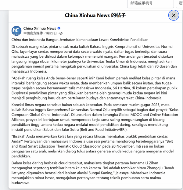 近日,新华社对学校智慧课堂建设与中印尼教育合作实践进行专题采访报道。相关新闻以印尼语标题China dan Indonesia Bangun Jembatan Kemanusiaan Lewat Konektivitas Pendidikan发布于新华全媒新闻信息服务平台,并被印尼国家通讯社 ANTARA、Netralnews 以及 Facebook“China Xinhua News”官方账号等海外媒体和平台转载发布,充分展现了学校在教育数字化转型、课程国际化建设和中外人文交流方面取得的积极成效。