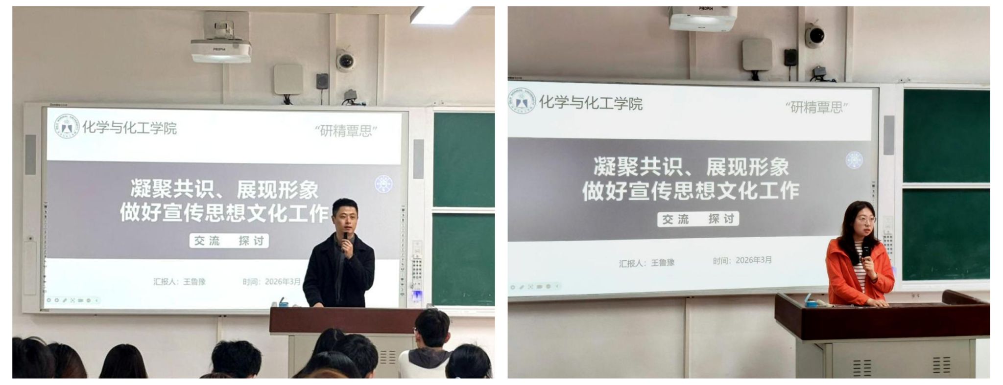 为提升辅导员、新进教师及学生宣传骨干的专业素养和业务能力,提高学院宣传思想文化工作质效,3月26日,化学与化工学院在一号教学楼举行第六期“研精覃思”辅导员赋能圆桌派活动,聚焦宣传思想文化工作展开培训与交流。学院党委书记巩磊、副书记梅茹、团总支书记杨睿出席,全体辅导员、新进教师、学生会、自管会、新媒体中心成员及各班级宣传委员参加。活动由杨睿主持,辅导员王鲁豫主讲。