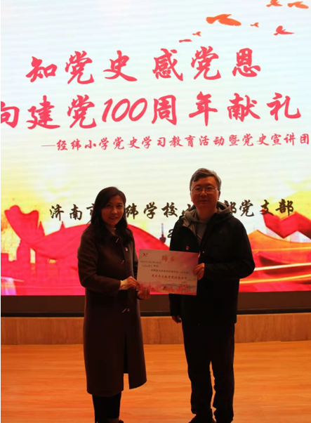 为庆祝中国共产党成立100周年,落实立德树人根本任务,积极服务社会服务基础教育,3月30日,生命科学学院学生党支部联合济南市经纬小学开展了党史学习教育共建活动,学院党总支副书记陈利虎、辅导员房继德、魏家庄街道办事处党工委副书记程立国、麟祥街社区书记季芹参加了此次仪式。