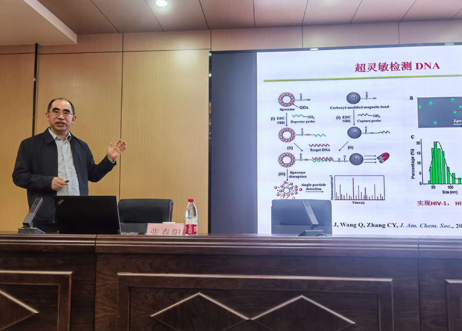 报告会上,张春阳介绍了单分子检测技术的发展历史和应用,从单分子检测技术的基本原理,肿瘤生物标志物的类型与功能,检测生物标志物的新方法以及单分子检测技术在生物研究、临床诊断的应用等方面详细介绍了其科研团队的工作与科研成果,并对未来的检测工作进行了展望。张春阳肯定了学校科学研究方面的发展成绩,同时对化学学科的建设提出了建议和意见。