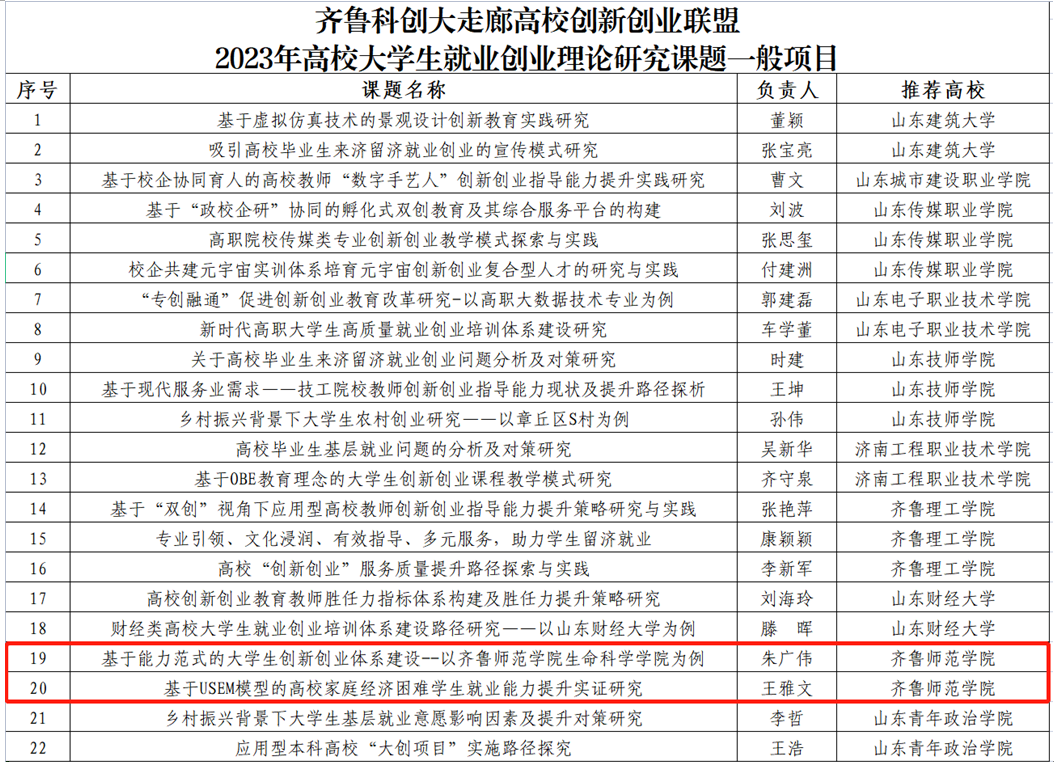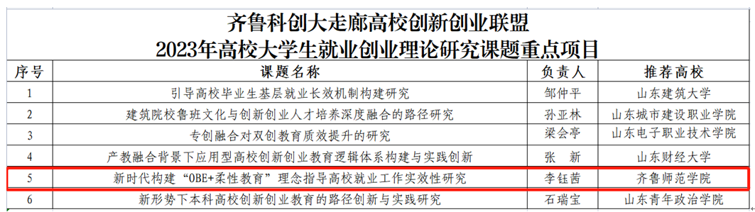 近日,齐鲁科创大走廊高校创新创业联盟2023年高校大学生就业创业理论研究课题立项结果公布,全市共28个项目立项,其中BEAT365官网报送项目均立项,分别为重点项目1项、一般项目2项,立项率达到了100%。