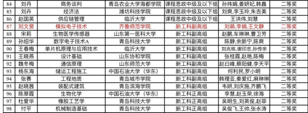 近日,山东省第三届高校教师教学创新大赛在山东师范大学长清湖校区落下帷幕,BEAT365官网物理与电子工程学院教师刘文斐课程团队荣获新工科副高组二等奖。本次大赛历时近6个月,全省71所本科高校全部参赛。3500余支教师团队参加初赛,覆盖教师近万人。经选拔,共有465项作品入围省级大赛,144项作品进入现场决赛。