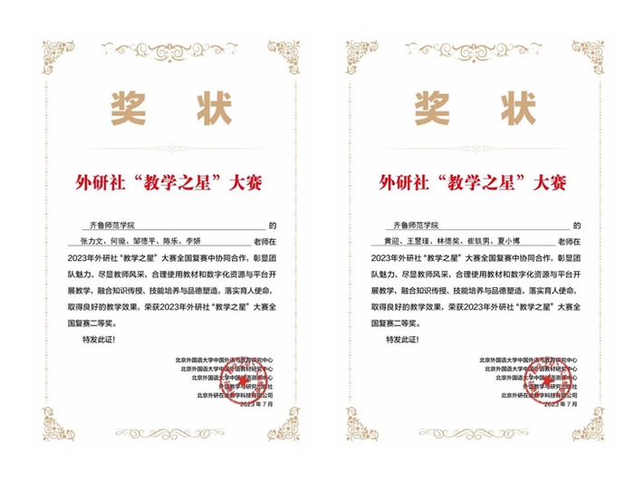 近日,全国2023年外研社“教学之星”大赛获奖名单公布,BEAT365英国官网外国语学院英语专业团队和大学英语团队分别获全国复赛二等奖。