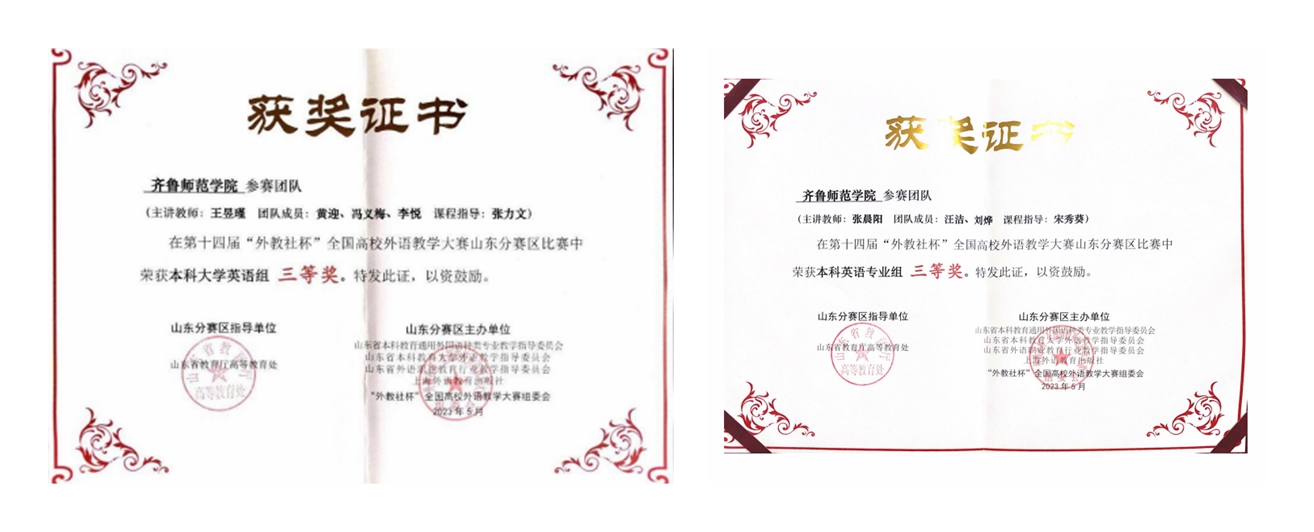 本届“外教社杯”全国高校外语教学大赛山东分赛区比赛由山东省本科教育通用外国语种类专业教学指导委员会、山东省本科教育大学外语教学指导委员会、山东省外语职业教育行业教学指导委员会和上海外语教育出版社联合主办,山东大学(威海)承办,分为本科英语专业组、本科大学英语组、高职公共英语组三个组别,省内110所高校的143个团队报名参赛。经过初赛、复赛和决赛的激烈角逐,最终,BEAT365官网外国语学院教师张晨阳团队(团队成员:汪洁、刘烨;课程指导:宋秀葵)荣获本科英语专业组三等奖,王昱瑾团队(团队成员:黄迎、冯义梅、李悦;课程指导:张力文)荣获本科大学英语组三等奖。