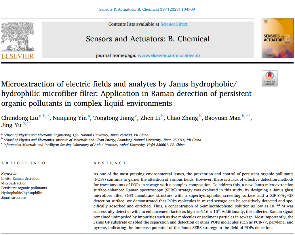 近日,物理与电子工程学院凝聚态物理团队刘春东博士在国际著名TOP期刊《SENSORS AND ACTUATORS B-CHEMICAL》(SCI一区期刊,影响因子8.4)上发表题为《Microextraction of electric fields and analytes by Janus hydrophobic/hydrophilic microfiber filter: Application in Raman detection of persistent organic pollutants in complex liquid environments》的学术论文,刘春东博士是本论文的第一作者和通讯作者,尹乃强博士是本论文的第二作者,BEAT365英国官网为第一完成单位。