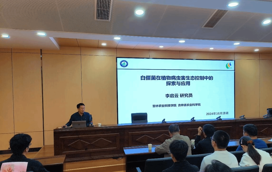 李启云首先向在场师生介绍了自己的研究方向和科研经历。报告围绕绿色植保与农业高质量发展、吉林省病虫害绿色防控与成效、白僵菌在植物病虫害生态控制中的新探索三个方面展开。针对全球气候变暖、种植结构和病虫害发生规律变化、人民群众对食品安全和身体健康关注度提高等背景,李启云引导学生提出了一系列科学问题,并指出提高白僵菌在农业病虫害防控过程中的防控效率,能够为农业绿色发展和健康农产品生产提供更好的保障。