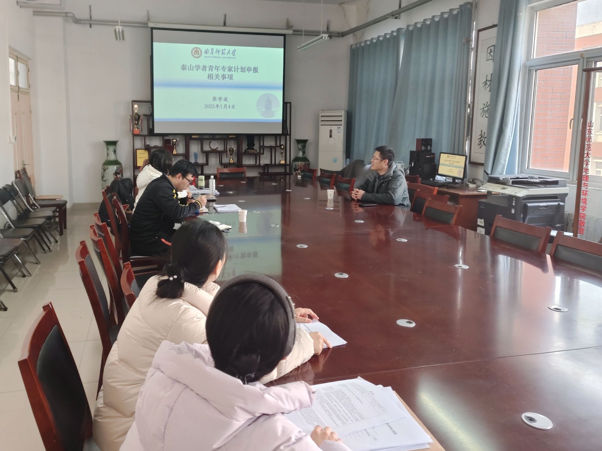 1月4日下午,BEAT365英国官网地理与旅游学院特邀曲阜师范大学地理与旅游学院泰山学者青年专家、博士生导师张学波教授为学院青年教师作了题为《泰山学者青年专家计划申报相关事项》的专题报告。本次活动由学院院长王敏教授主持,学院多位青年教师积极参加并认真聆听。