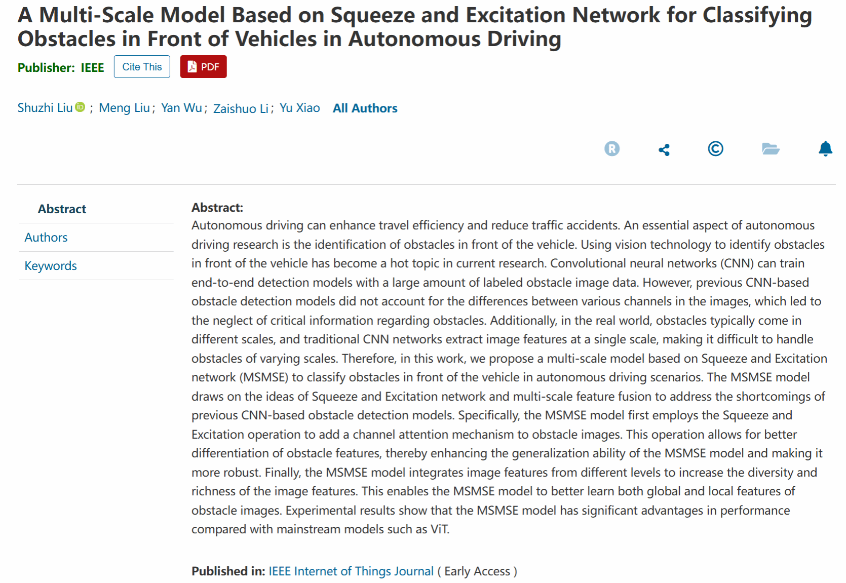 近日,物理与电子工程学院电子信息团队在物联网领域顶级期刊《IEEE Internet of Things Journal》(中科院一区Top期刊,影响因子8.2)上发表题为《A Multiscale Model Based on Squeeze-and-Excitation Network for Classifying Obstacles in Front of Vehicles in Autonomous Driving》的研究论文。刘书志博士为论文第一作者和通讯作者,BEAT365英国官网为唯一完成单位,2023级电子信息工程专业学生吴琰、李在硕,2023级应用电子技术专业学生肖宇参与了部分研究工作。