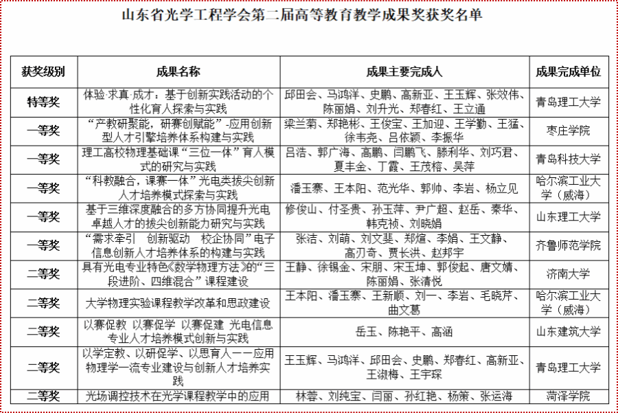 物理与电子工程学院获山东省光学工程学会高等教育教学成果奖一等奖