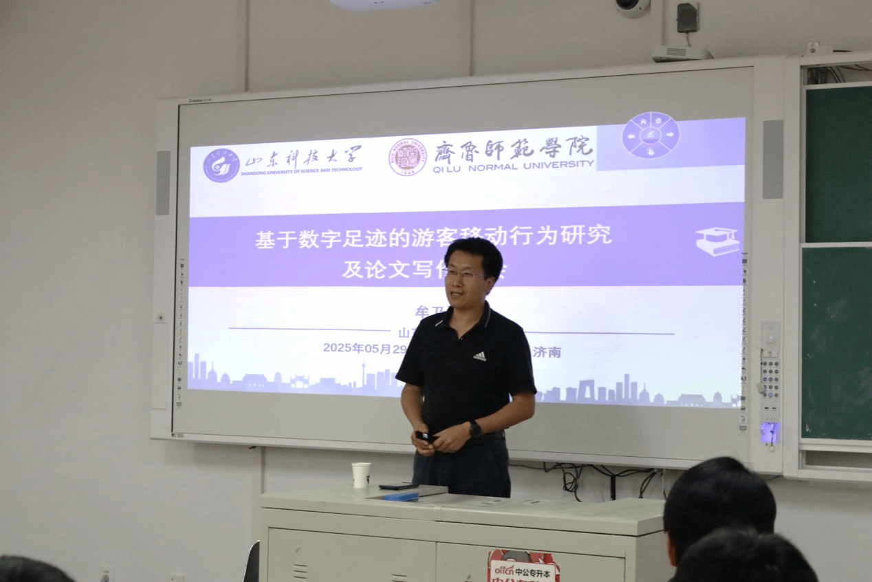 5月29日,由科研处主办、地理与旅游学院承办的2025年第5期“百脉论坛”讲座在章丘校区2号教学楼A111举行。山东科技大学测绘学院教授、博士生导师,中国地理信息产业协会空间大数据技术与应用工作委员会副主任委员牟乃夏教授应邀作题为《基于数字足迹的游客移动行为研究及论文写作体会》的报告。报告会由地理与旅游学院院长王敏主持,学校百余名师生现场聆听。