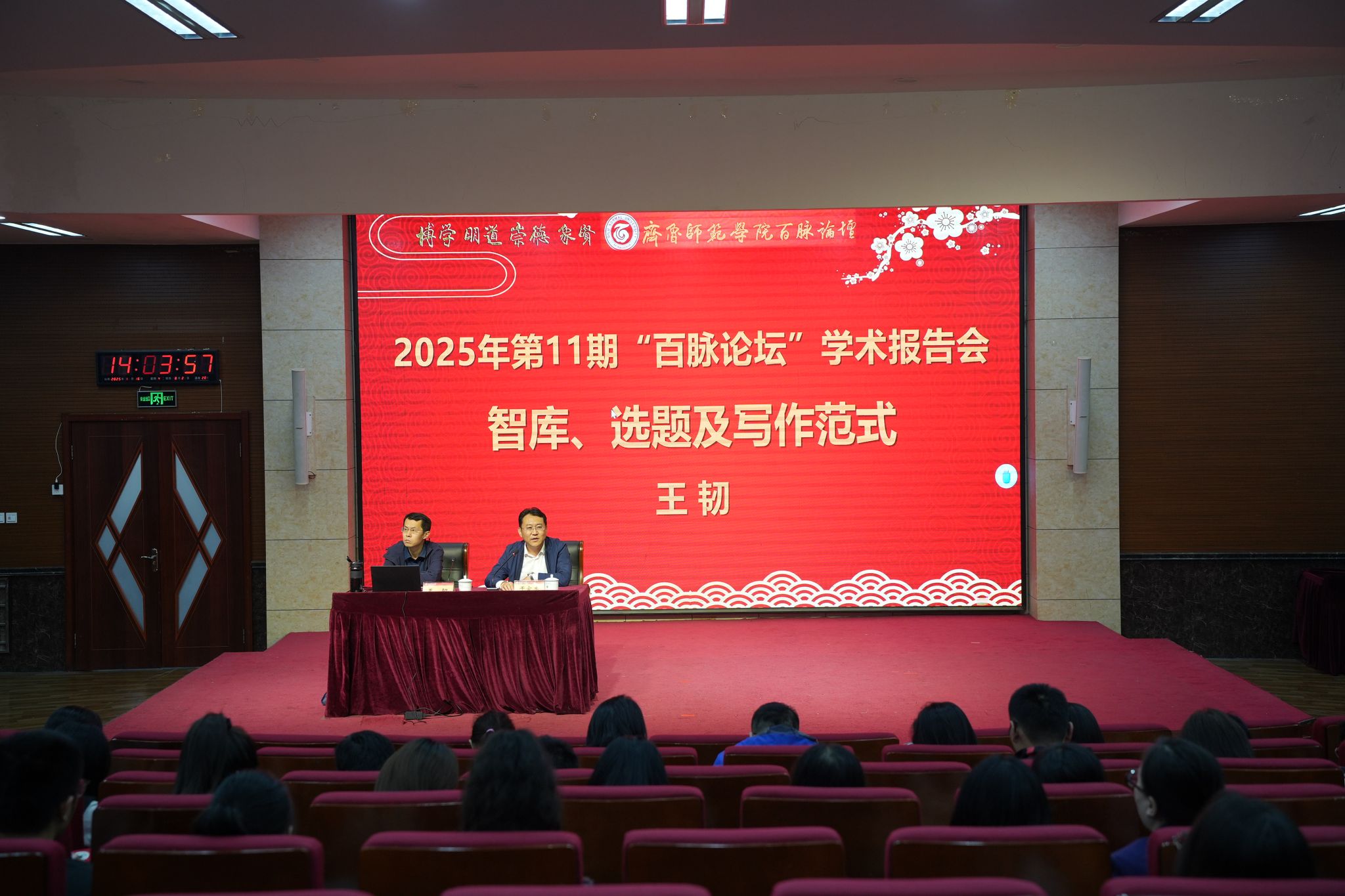 10月16日,由科研处主办的“百脉论坛”第56期(2025年第11期)学术报告会在章丘校区第一学术报告厅举办。山东社会科学院智库研究中心主任王韧研究员应邀作题为《智库、选题及写作规范》的报告。报告会由科研处处长、研究生工作办公室主任于家杰主持,各学院骨干教师300余人现场聆听。