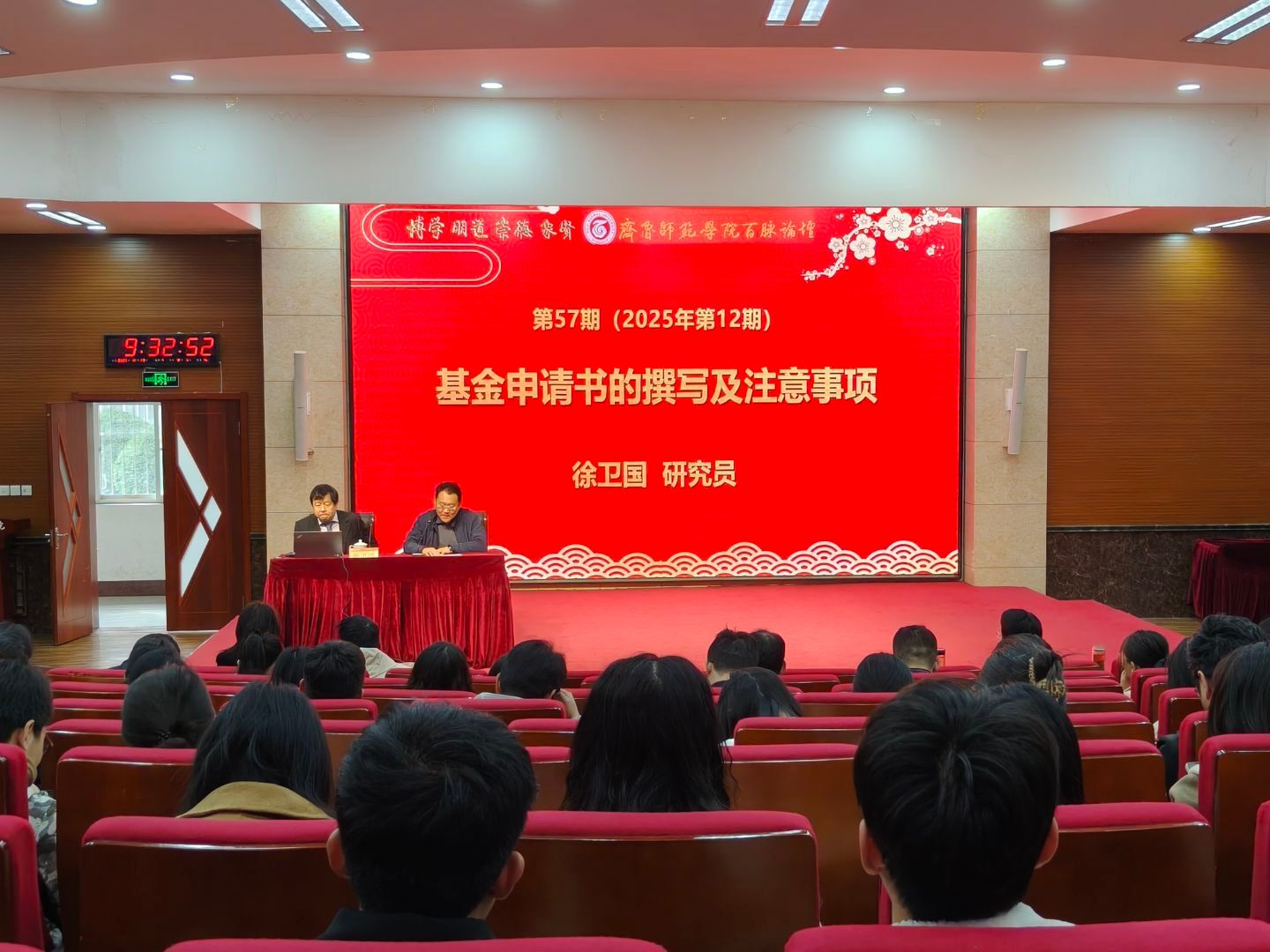 10月23日,由科研处主办、地理与旅游学院承办的“百脉论坛”第57期(2025年第12期)学术报告会在章丘校区第一学术报告厅举行。《中国科学基金》原副主编徐卫国研究员应邀作题为《基金申报书的撰写与注意事项》的专题报告。报告会由科研处处长、研究生工作办公室主任于家杰主持,各学院200余名青年教师参加了此次报告会。