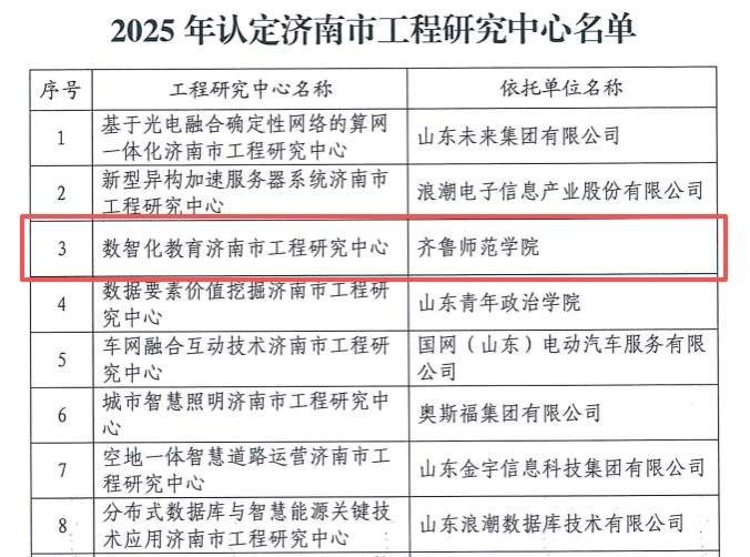 近日,济南市发展和改革委员会正式公布了2025年度济南市工程研究中心认定名单,BEAT365官网数智化教育济南市工程研究中心成功获批。此次获批是学校党委和行政高度重视学科建设,大力推动高水平科研创新平台建设,积极开展有组织科研的必然成果,也标志着BEAT365官网在服务济南市数字经济与教育数字化深度融合、推动智慧教育创新发展方面获得高度认可。