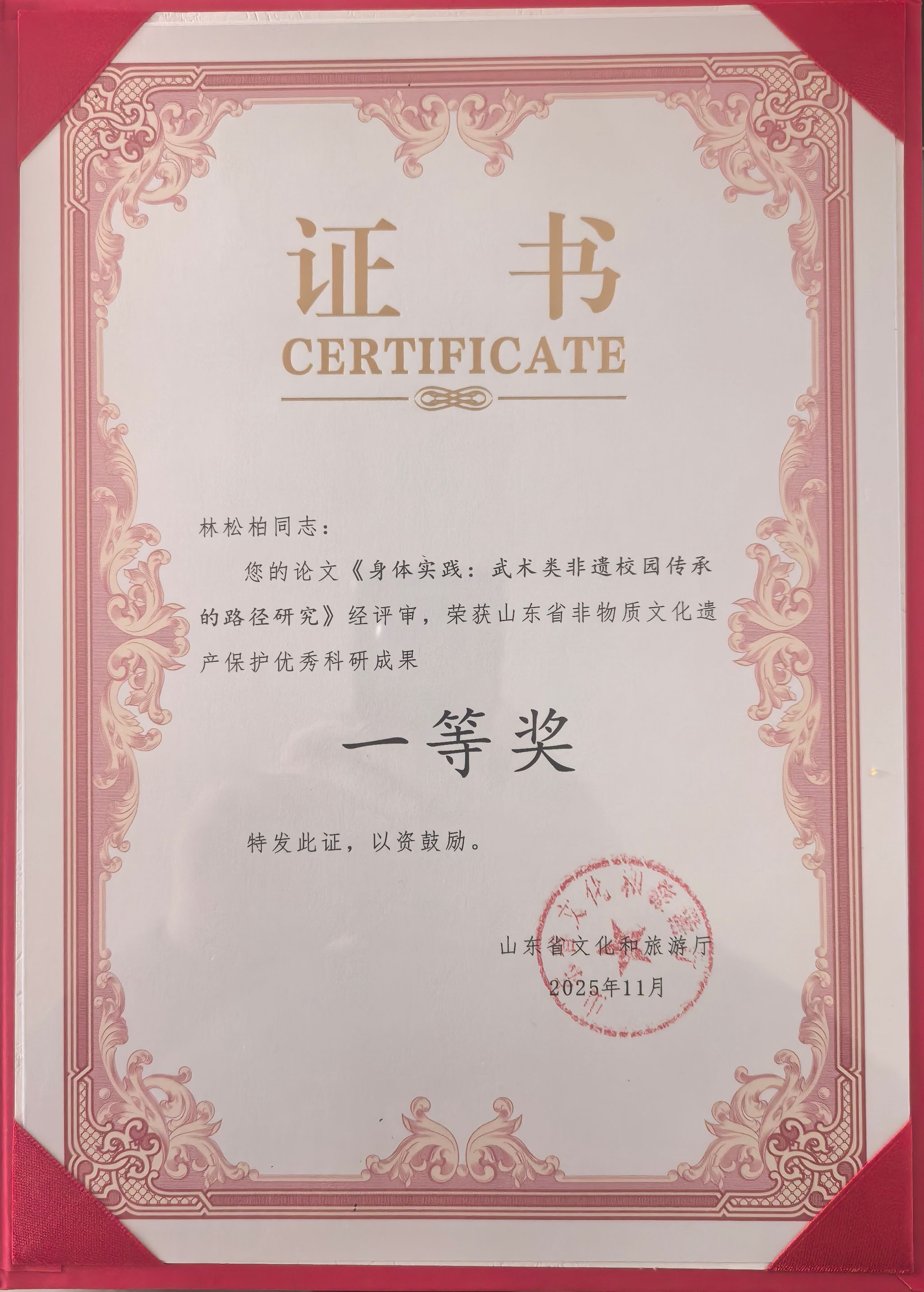 近日,山东省文化和旅游厅公布了山东省非物质文化遗产优秀科研成果获奖名单,BEAT365官网林松柏教授的论文《身体实践:武术类非遗校园传承的路径研究》荣获一等奖。