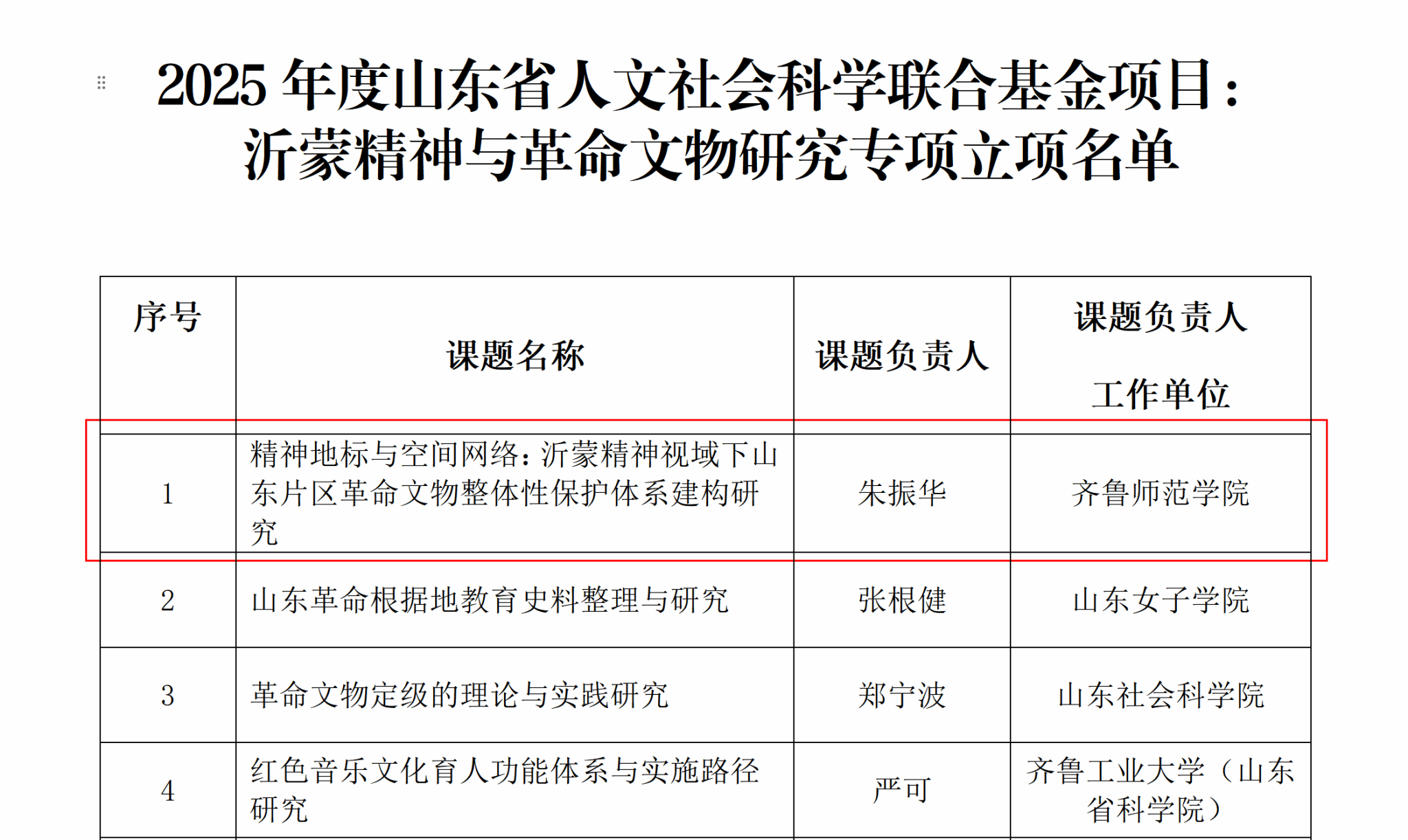 近日,山东省社会科学界联合会公示了2025年度山东省人文社会科学联合基金项目“沂蒙精神与革命文物研究专项拟立项名单”。学校文学院、历史文化学院朱振华教授团队申报的“精神地标与空间网络:沂蒙精神视域下山东片区革命文物整体性保护体系建构研究”成功立项,项目资助经费20万元。该项目成功获批是学校近年来大力弘扬齐鲁优秀传统文化,深耕红色文化遗产保护领域的重要体现。