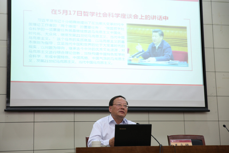 王立胜围绕建构中国特色哲学社会科学是时代的迫切需要,建构中国特色哲学社会科学要树立问题意识,建构中国特色哲学社会科学必须坚持马克思主义的立场、观点和方法,中国特色哲学社会科学的生命在于创新,发展21世纪马克思主义、当代中国马克思主义等五个方面阐述了习近平总书记在哲学社会科学工作座谈会上的讲话基本内容。
