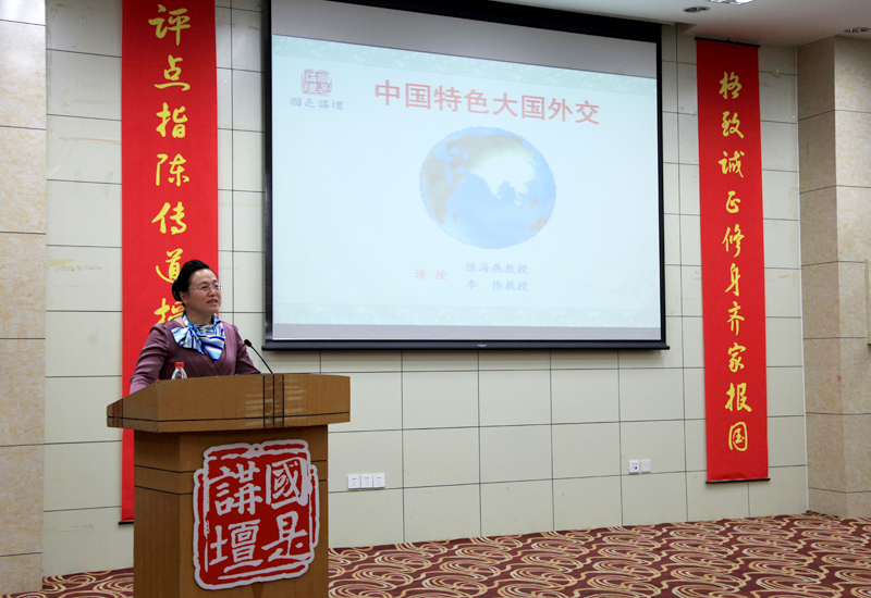 “在风云变幻的国际形势中我国的外交到底应当如何定位”、“为什么说我们的外交富有特色?”针对这种种迷茫和疑惑,两位教授侃侃而谈;师生互动,深入浅出,一改传统报告会“一人讲、多人听”的形式。首先,陈教授对中国特色大国外交的定位进行了解读,她指出中国特色“发端于博大精深的中华文明,源自于新中国外交的优良传统,契合于当今时代潮流和世界大势”。接下来,她从四个方面对中国特色大国外交的内涵特点进行了深刻阐述:第一,与传统大国外交“大国必霸,强国必战”不同,中国特色大国外交深知自己的责任,始终牢记为促进世界发展繁荣尽自己最大的努力。第二,中国特色大国外交主张合作共赢,树立双赢、多赢、共赢的新理念,强调大国的国际担当。第三,中国特色大国外交坚持为国内发展和改革开放服务的第一要务。第四,中国特色的大国外交是中国作为世界性大国的外交宣示,表明中国努力克服小国(弱国)心态,追求最大限度和持续的国际认同。最后,陈教授又从“大国是关键、周边是首要、发展是基础、“一带一路”是主线、多边外交着眼于争取话语权”等五位一体的角度对我国外交战略新布局进行了精彩分析。