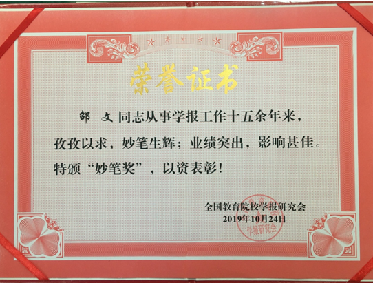 在全国开展“不忘初心、牢记使命”主题教育的背景下,为了深入学习习近平总书记《在哲学社会科学工作座谈会上的讲话》等一系列重要讲话精神,更好地完成新时代赋予哲学社会科学及学术期刊的历史使命,检阅办刊成绩,总结办刊经验,全国教育院校学报研究会于10月下旬开展了全国教育院校学报评优活动,同时为从事编辑工作十五年以上的学报同仁颁发“妙笔奖”。