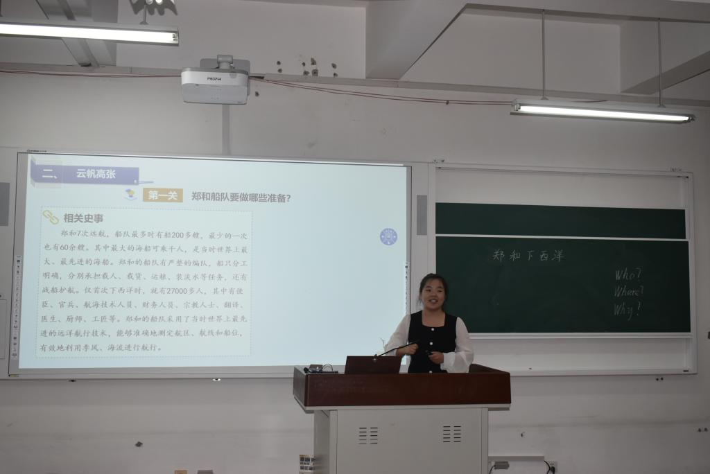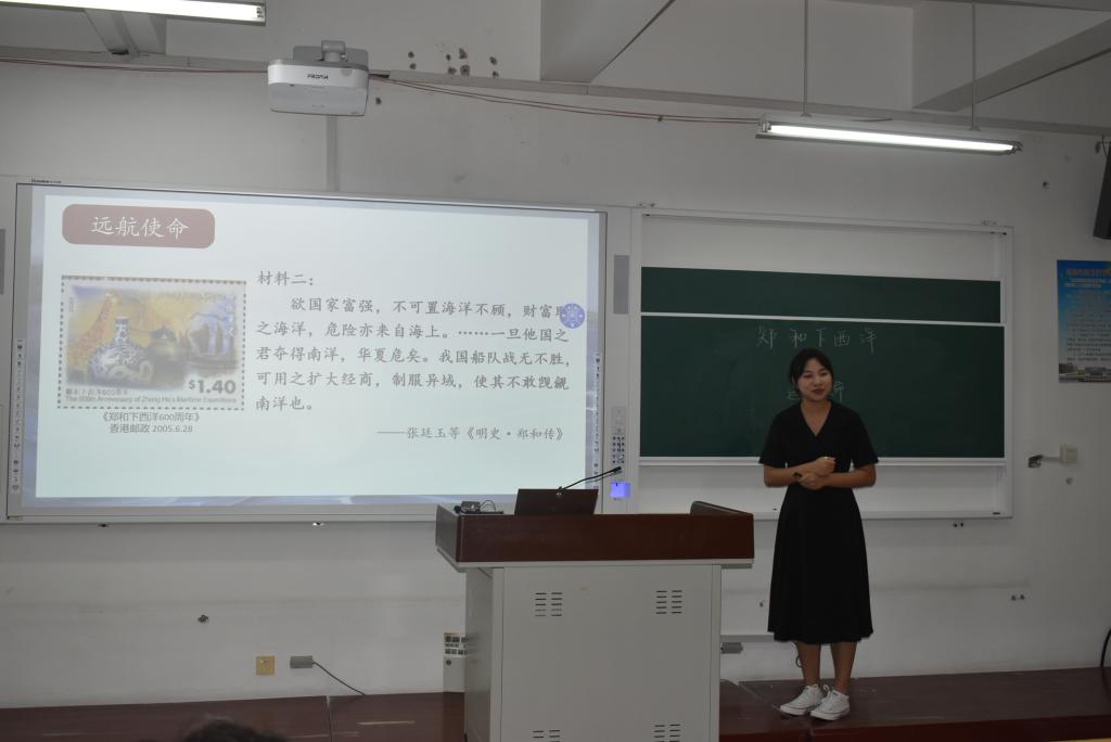 接下来,张劭慧、孙淑琦、郝亚洁三位同学围绕《郑和下西洋》一题进行了展示。初中历史推荐组一等奖张劭慧同学借助富有亲和力的语言讲述郑和下西洋的故事,拉近了同学们与历史的距离,赢得了观摩同学们的好评。初中历史抽取组二等奖孙淑琦同学从研读课标入手,遵循“贴近生活”的理念设计了本课教学,给人耳目一新。初中历史抽取组二等奖郝亚洁同学从细节着手,丰富了学生历史学习资源,展现了良好的素养。