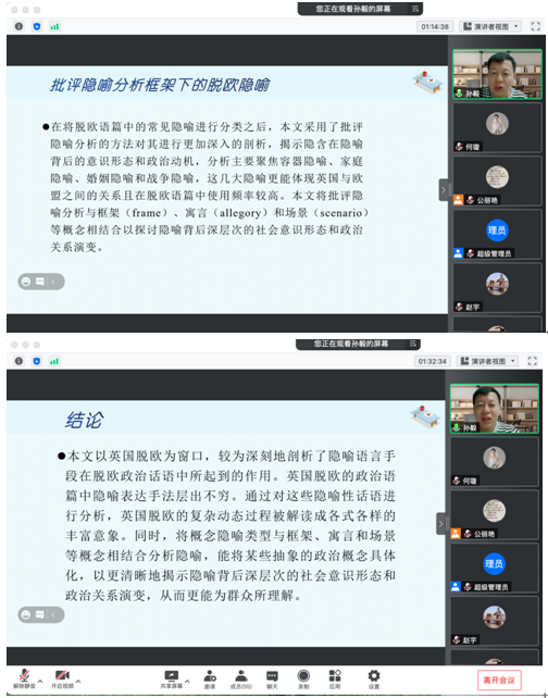 10月27日晚,外国语学院特邀广东外语外贸大学孙毅教授作了题为“隐喻脱欧与脱欧隐喻—英国脱欧语篇的批评隐喻分析”的线上学术讲座。本次讲座由外国语学院院长宋秀葵主持,副院长李百温、学院全体教师共同聆听了此次讲座。