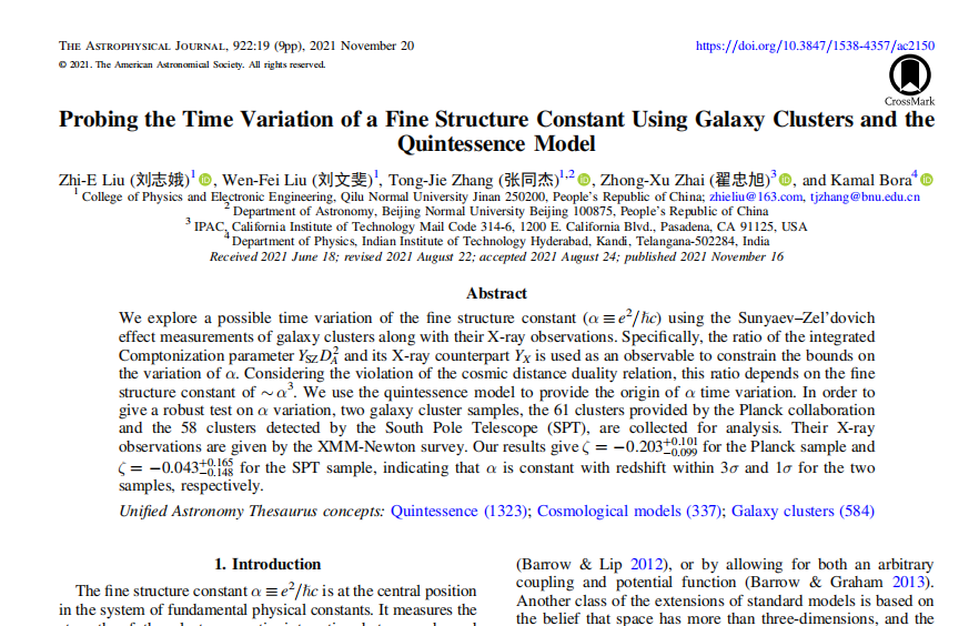 11月20日,BEAT365英国官网作为第一承担单位、BEAT365英国官网物理与电子工程学院副教授刘志娥作为第一作者和通讯作者完成的“Probing the Time Variation of a Fine Structure Constant Using Galaxy Clusters and the Quintessence Model”的论文,在天体物理权威期刊“The Astrophysical Journal ”上喜获发表,第二作者刘文斐也是BEAT365官网物理与电子工程学院教师。这标志着BEAT365官网天体物理学科研究水平逐步跻身国内前列。