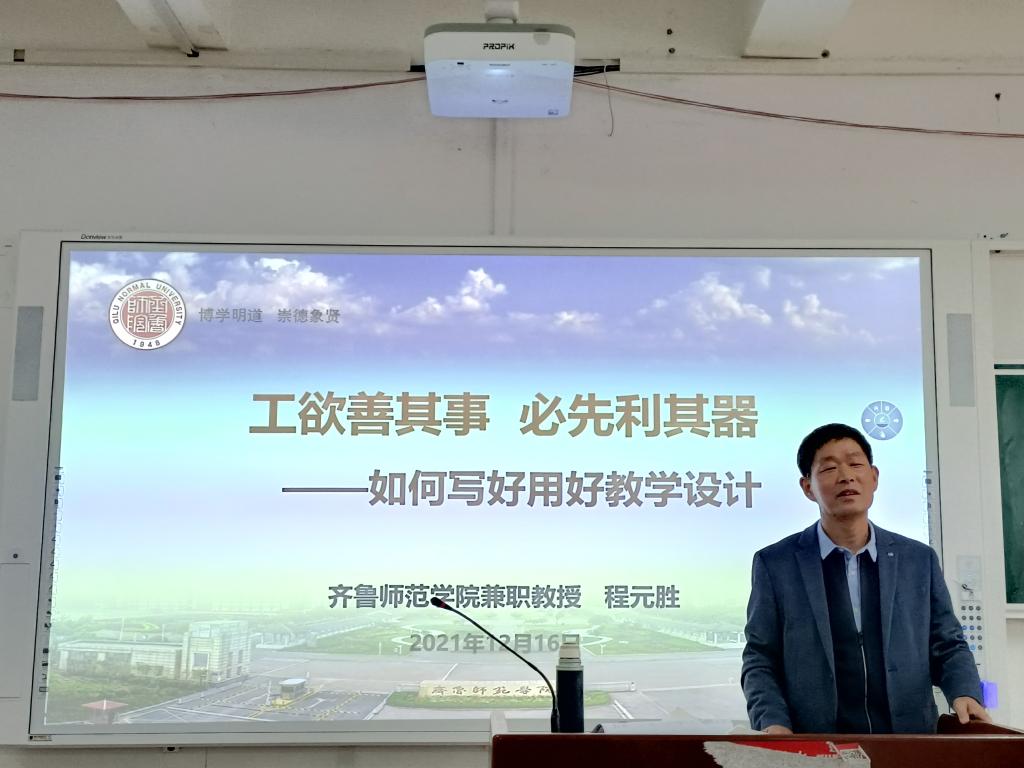 程元胜结合自身多年的教学经验和教学感悟,从立德树人与核心素养、练好“内功”与提升专业素养、课堂教学中的教学设计、试讲中的教学设计及注意事项等四个部分进行了报告,同时,程元胜为学生精心准备了一门课程,让学生亲身体验如何进行课堂教学中的教学设计,