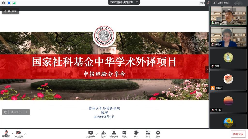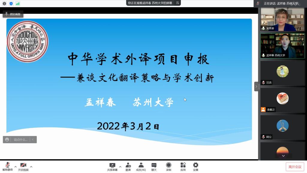 3月2日晚,外国语学院特邀苏州大学孟祥春教授、陆洵教授开展了国家社科基金中华学术外译项目申报经验分享,两位教授分别作了题为“中华学术外译项目申报兼文化翻译策略与学术创新”、“中华学术外译项目申报解读”的学术报告。报告采取腾讯会议的形式,由外国语学院院长宋秀葵主持,副院长李百温及全体教师聆听了本次报告。