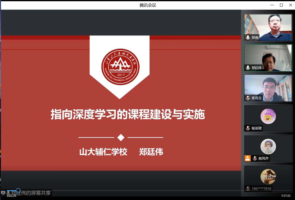 在下午的报告会上,首先,山大辅仁学校校长、党总支书记郑廷伟作了题为《指向深度学习的初中数学大单元教学研究与实践》的报告。郑廷伟从深度学习的价值和意义、基于大概念的单元教学研究、基于大概念的单元设计案例介绍了学校在指向深度学习的初中数学大单元教学进行的研究与实践。