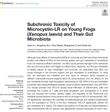 随着现代化工业和农业生产的迅速发展以及全球气候不断变暖,淡水水体富营养化程度日益加剧,蓝藻水华频发。微囊藻毒素-LR(MC-LR)是蓝藻水华过程中产生的最常见且毒性最大的一种蓝藻毒素。两栖动物由于复杂的生活史和高度的皮肤渗透性,比其他脊椎动物更易受到水体环境污染的影响,生存环境中化学污染物的暴露已成为其种群数量下降的重要原因。尽管MC-LR对哺乳动物和鱼类的毒性作用已被广泛研究,但其对两栖动物免疫系统和肠道菌群的影响尚未得到足够重视。