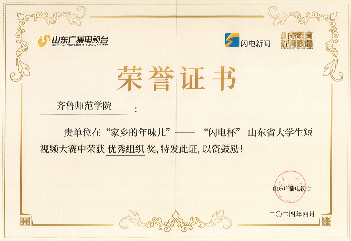 近日,山东广播电视台主办的“闪电杯”山东省大学生短视频大赛公布获奖结果,学校获得优秀组织奖,美术学院学生张洁的作品《家乡的年味—赶年集》获得优秀奖。该项赛事在2024年春节期间举办,旨在弘扬中华优秀传统文化,展现乡村振兴卓越成就,通过家乡变化折射祖国变化,学校积极组织学生参与,举行校级比赛共推选出10件作品参与省级评选。