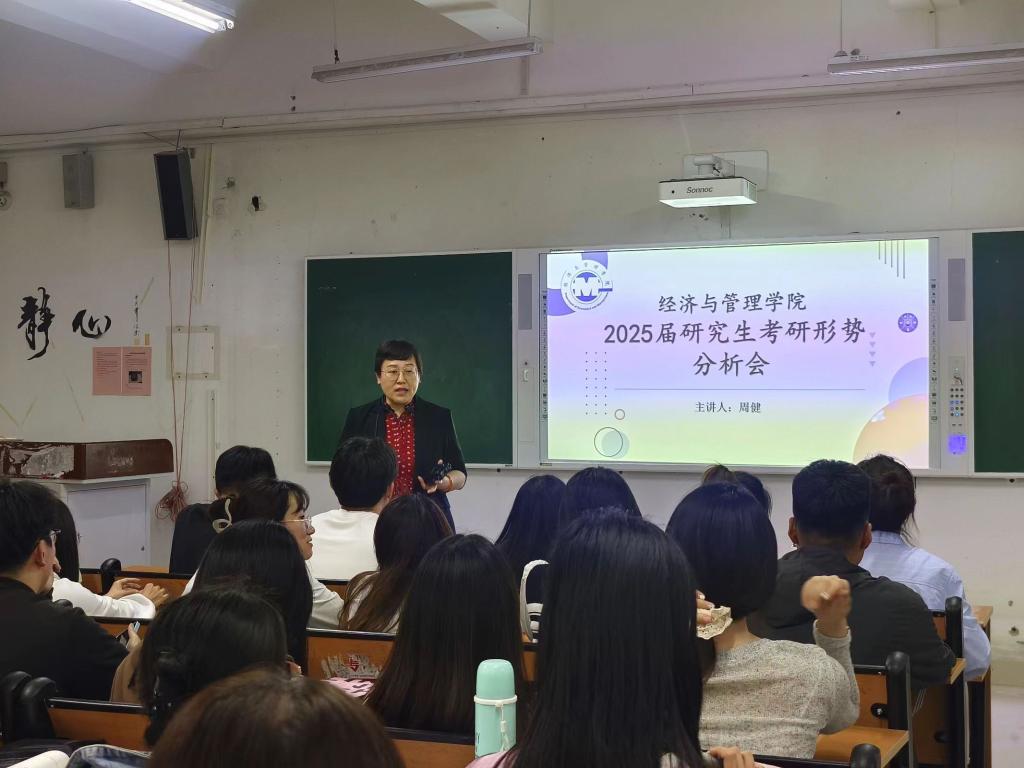 为帮助2025届毕业生学生了解考研相关信息,明确考研目标与方向,4月19日晚,经济与管理学院在一教b208教室举行2025届研究生考研形势分析会。本次会议由学院院长周健担任主讲人,有考研意向的2025届学子现场聆听。