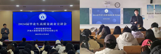 为进一步推进2024届毕业生就业工作,加强学生对当前就业形势的了解,搭建毕业生与企业之间沟通的桥梁,12月28日,化学与化工学院于二号教学楼A111报告厅、一教A507教室举办2024届毕业生高质量就业宣讲系列活动。参加本次活动的有济南大智教育培训学校有限公司人力资源部贾琦、2013届校友周顺发、化学与化工学院党委副书记巩磊、辅导员梁永鑫及2024届本科毕业生。宣讲会由巩磊主持。