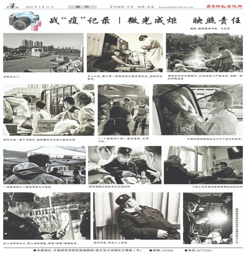 近日,2022年度山东省高校校报优秀新闻作品奖评选结果公布,教师教育学院学生王芝泽拍摄的《战“疫”记录|微光成炬 映照责任》荣获新闻摄影类一等奖。