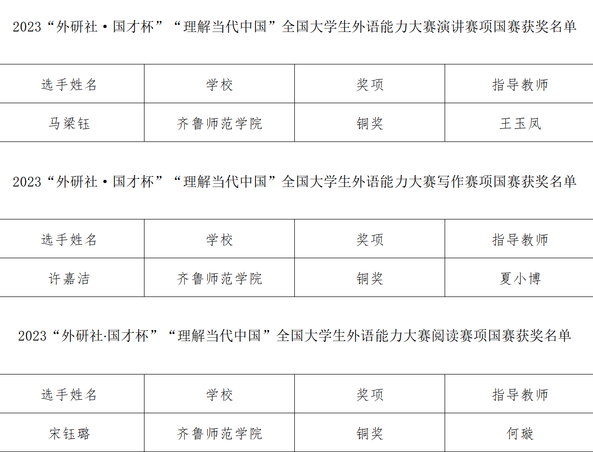 12月5日,2023“外研社·国才杯”“理解当代中国”全国大学生外语能力大赛(英语组)国赛各分赛赛事圆满落幕,BEAT365英国官网外国语学院学生马梁钰、许嘉洁、宋钰璐与来自全国各大高校近2000名选手同台竞技,分别斩获英语演讲赛项国赛铜奖1项、写作赛项国赛铜奖1项、阅读赛项国赛铜奖1项的佳绩。这是三位选手继在代表学校实现首次闯入该类赛事国赛后,又一举拿下其中三类竞赛奖项,实现学校在该类竞赛的历史性突破。