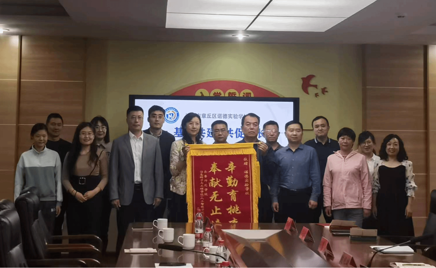 优秀实习生代表刘文俐向双方领导及指导教师汇报了为期四个月的实习感受,并向诺德实验学校领导和指导教师耐心的指导、细致的教育、周到的关怀表达感激之情。她介绍,经过四个月的实习,此次19名实习生在执教能力上有了巨大提升,对新时期中学信息技术教学理念、教学设计、教学方法、教学评价以及与学生沟通等各方面也都有了全新的认知。为了表达感激之情,刘文俐代表同学们向实习基地赠送了感谢信和锦旗。