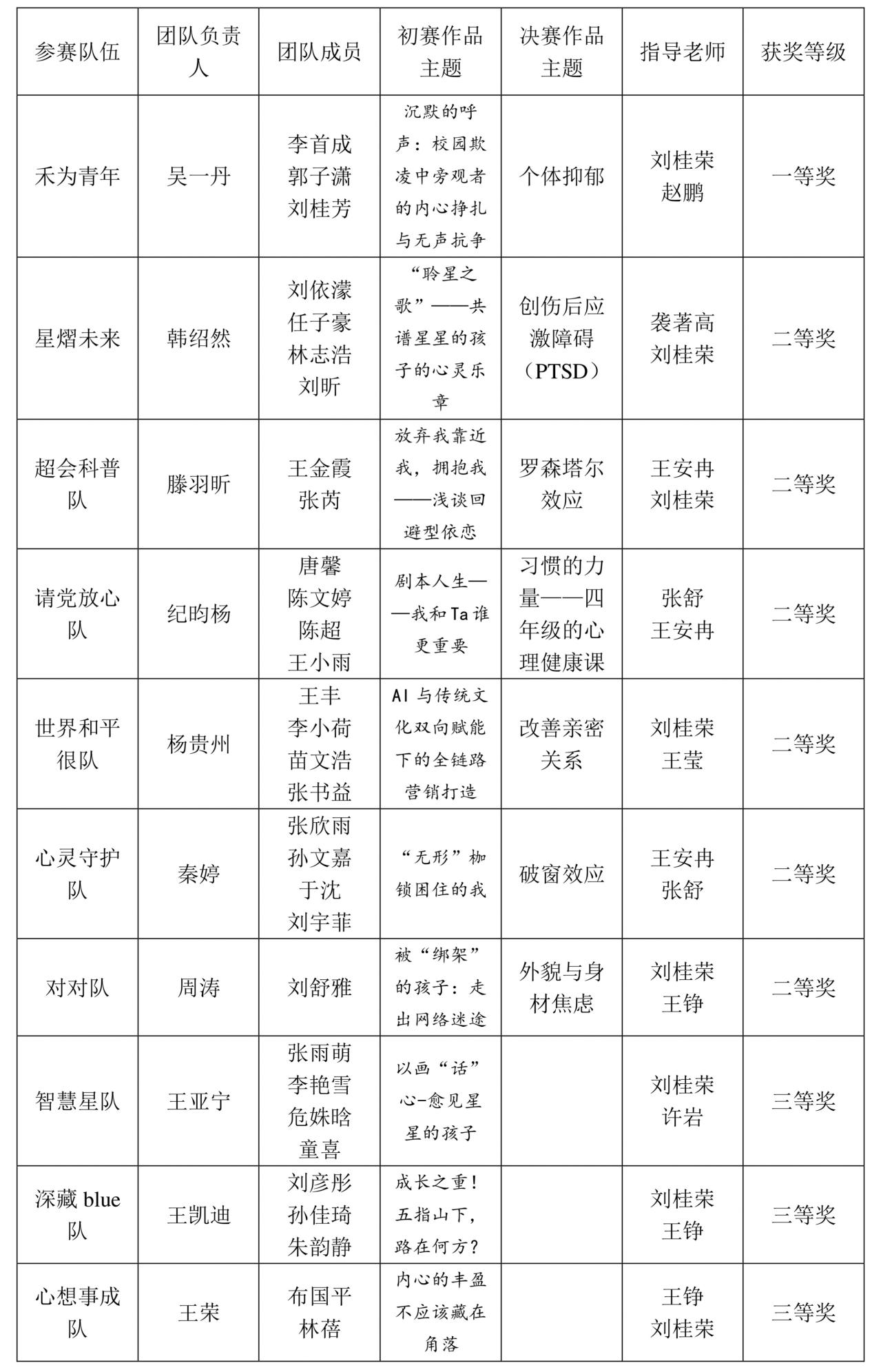 本届大赛分为心理辅导技能创新、心理教育教学创新、应用心理案例开发、心理科普影视创作四个赛道。教师教育学院各年级学生踊跃参赛,自发组队23支,展现出了高昂的比赛热情,在老师们的悉心指导下积极备赛,经历了初赛前指导-初赛指导-决赛前指导-决赛指导四个阶段。生命科学学院、信息科学与工程学院(人工智能学院)学生在心理课堂上得知此次比赛后也踊跃报名,并在刘桂荣、张舒、王安冉三位教师的帮助指导下刻苦备赛,展现出师院学子积极向上、敢拼敢赢的精神风貌。