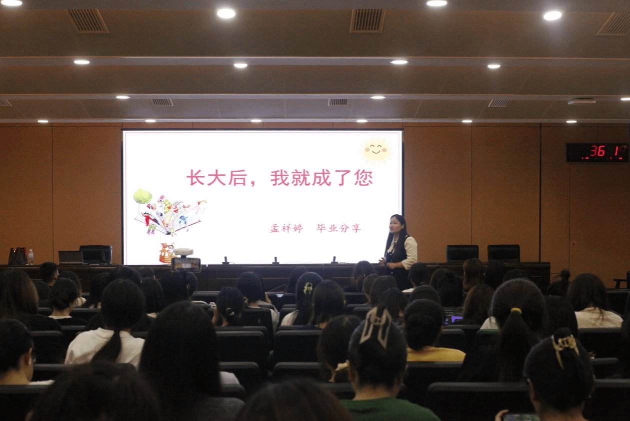 首先,孟祥婷讲述了自己的职业发展规划和历程,着重分享了她参加教师招聘考试及工作八年来的成功经验,特别强调正是母校对她的锻造使她屡获佳绩。孟祥婷在工作中积极参加各种培训,主动靠近名师,学习名师的教学艺术,并善于在教学实践中内化和使用。