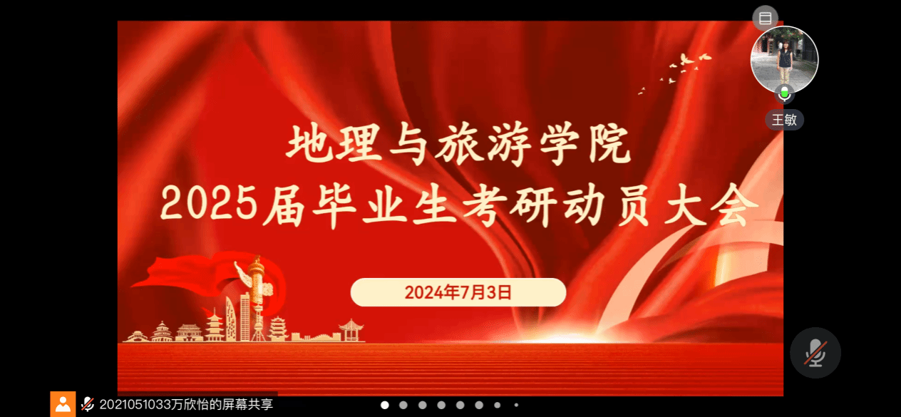 为进一步加强学院学风建设,帮助学生了解考研相关信息,激发学生的考研热情,帮助他们明确目标、增强信心,为顺利备考奠定基础,7月3日,地理与旅游学院举行2025届毕业生考研动员大会。学院全体行政人员、各班班主任老师、学生学业导师以及2021级全体本科生参加,学院巩合德教授出席会议并作报告。会议由辅导员片康主持。