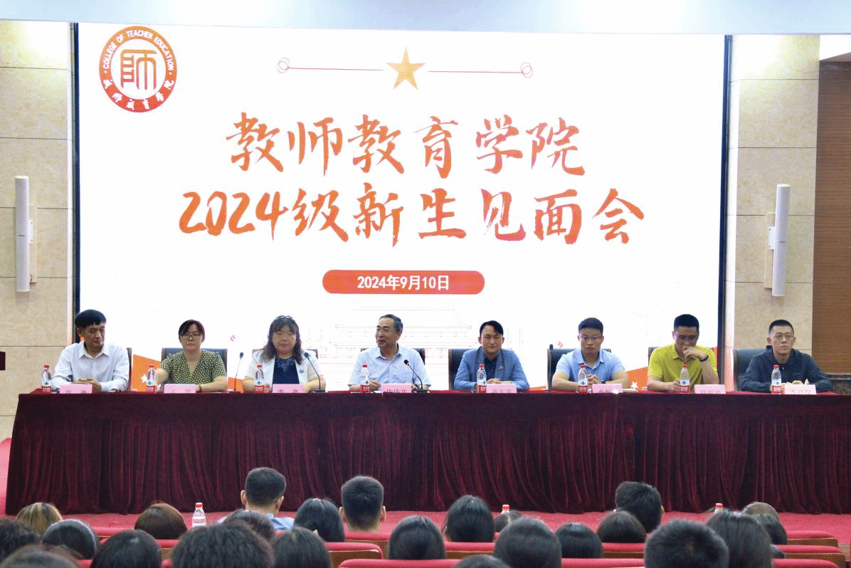 为欢迎2024级新生,庆祝第40个教师节,9月10日晚,教师教育学院2024级新生见面会在章丘校区第一学术报告厅举行。学院院长毕诗文、党委书记姜东菲、副院长李爽、党委副书记栾毅之,副院长王蕾、范勇,院长助理徐明波、团总支书记李炜琛、2024级辅导员袭著高、柴通及学院全体辅导员和2024级新生参加。会议由李爽主持。