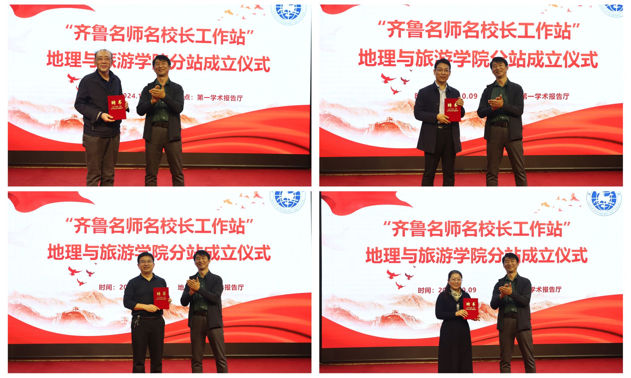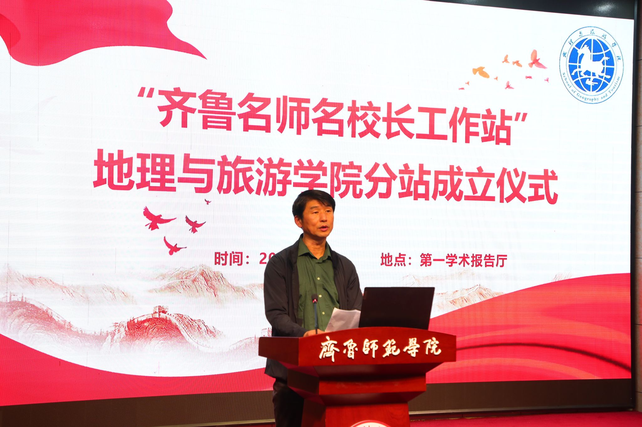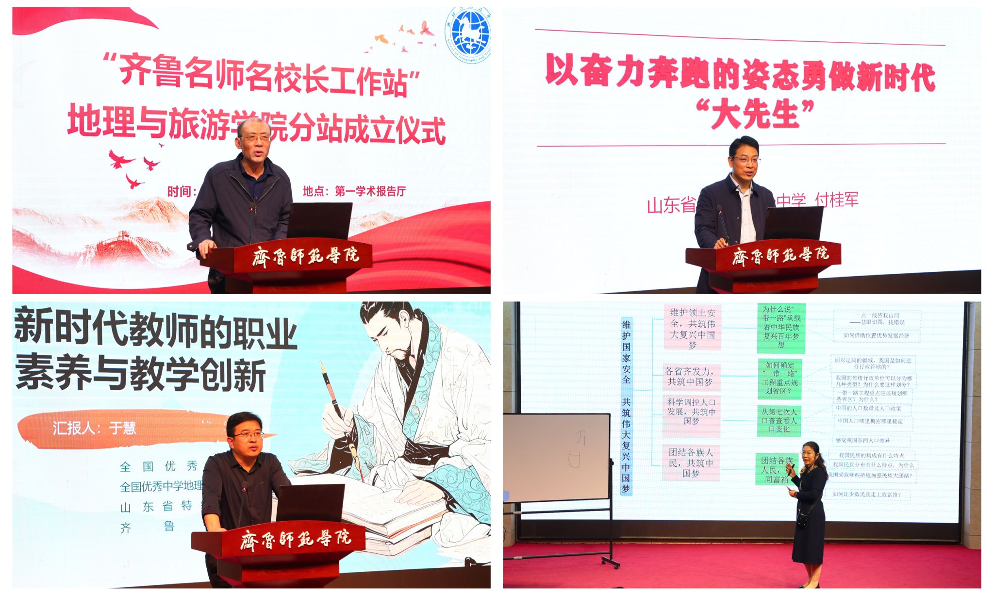 活动伊始,举行“齐鲁名师名校长工作站”地理与旅游学院分站成立仪式,仪式由王敏主持。宋新刚代表BEAT365英国官网对齐鲁名校长、齐鲁名师的到来表示热烈欢迎,他介绍了学校的基本情况,强调了此次分站成立的重大意义。`代表齐鲁名校长、名师进行致辞,他肯定了BEAT365英国官网在培养地理师范生方面取得的成绩,并对未来的教育事业发展进行了展望。宋新刚为出席本次活动的齐鲁名校长、齐鲁名师颁发了BEAT365英国官网特聘教授聘书。秦拓宣布“齐鲁名师名校长工作站”地理与旅游学院分站成立,并指出,分站的成立将为学院提供更多优质教学资源,助力学院在教育教学和人才培养方面取得进一步提升。