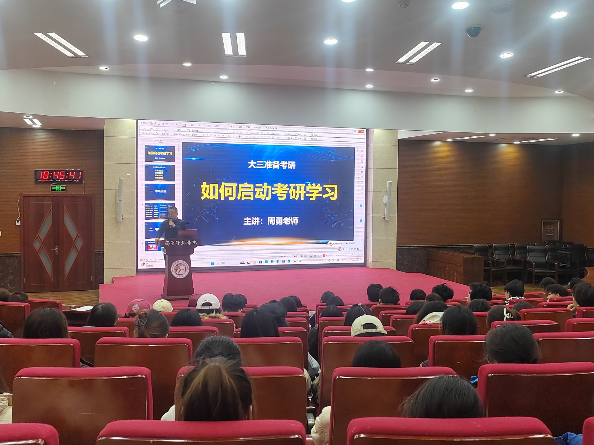 周勇拥有多年考研指导经验,曾担任多所高校创新创业导师。他对考研流程进行了整体介绍,并通过讲座和现场互动的方式,围绕考研院校和专业的选择、考研科目复习备考规划、就业与环境等多个维度进行了详细讲解,帮助学生们进一步明确考研时间、掌握备考流程、厘清规划思路。同时,他建议学生要做到早谋划、早打算、早准备,以积极向上的心态提升学历、充实自我。