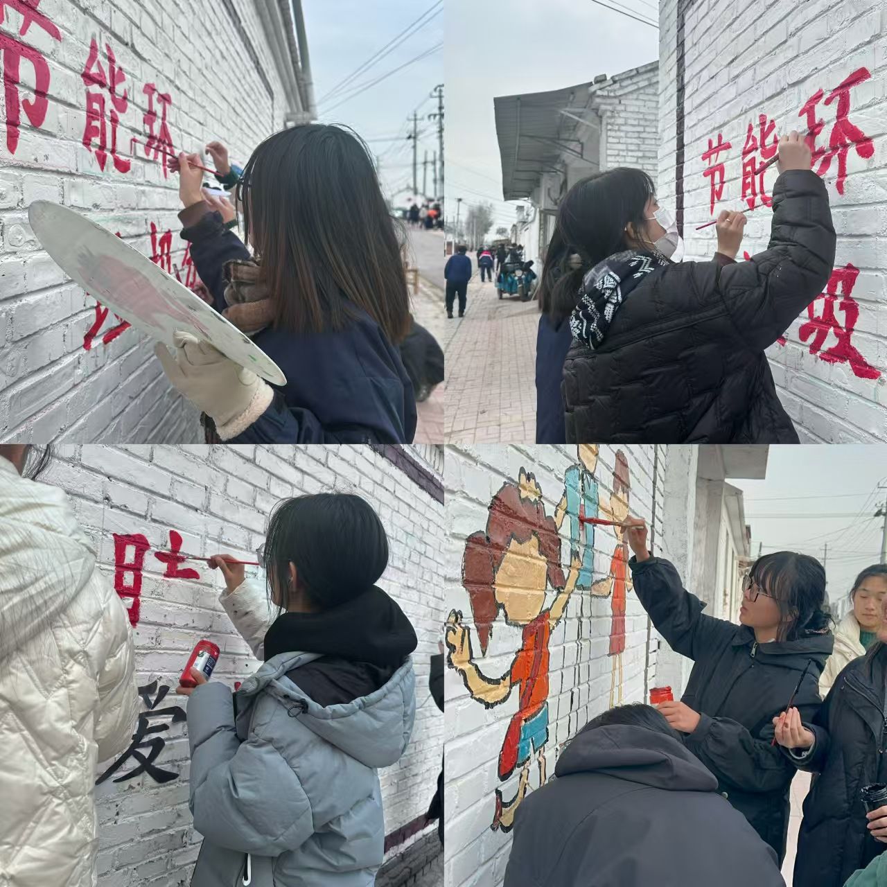 在绘制过程中,师生们不畏辛劳,分工明确、配合默契,有条不紊地进行着墙体彩绘工作,一笔一划勾勒出一幅幅美丽的画卷。他们巧妙运用色彩和构图,将绿水青山、孝善文化等元素融入墙绘中,使得原本单调的石砖墙变得妙趣横生,成为一道靓丽的风景线。村民们纷纷驻足观看,对这些精美的墙绘作品赞不绝口。