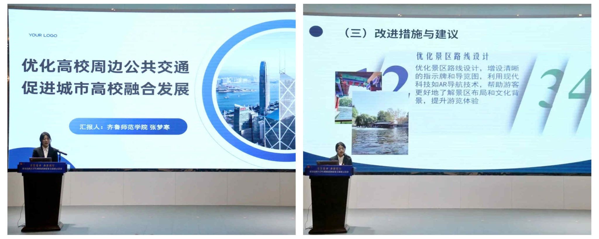 在交流展示活动中,张梦寒聚焦如何“优化高校周边公共交通,促进城市高校融合发展”,通过深入调研和广泛收集资料,提出了“完善配套硬件设施、公共交通信息化和强化公共安全意识”的策略;刘淑纯针对“健全大学生实践体系,筑牢校地融合根基”提案,提出要建立社区志愿服务长效机制和实施电商助农行动,助力章丘特色农产品与乡村旅游资源融合发展。两位同学精彩的讲解,赢得了评委们的高度认可。