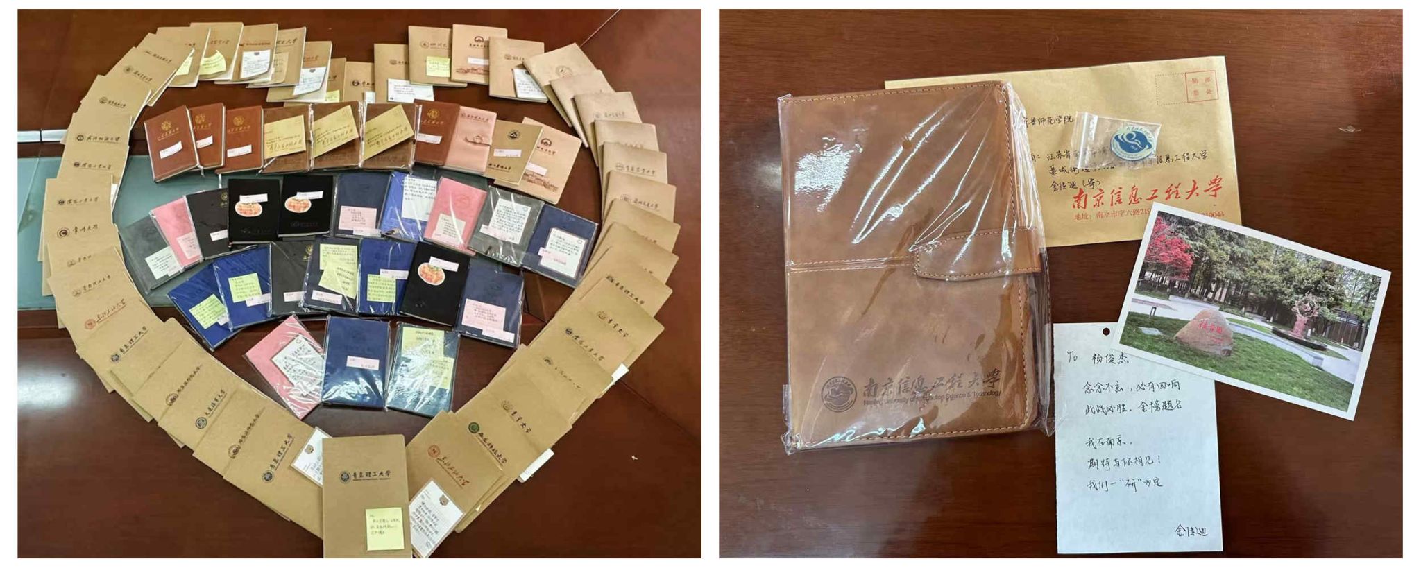 朋辈约定,“硕”果在望。马克思主义学院联系2024年已成功考上研究生的学长学姐,从考研学子已在院校,寄出了带有本院校校名、校徽标志的礼物。它们,或是一枚校徽,或是一张署名明信片,或是一个写满祝福语的笔记本,跨越祖国各地39个院校的近100份祝福,承载着美好的期许,承载着知识与力量的传递,将陪伴考研学子度过最后的冲刺时光,助力他们日夜兼程、逐梦前行,与学长学姐相约在目标院校,奔赴心目中理想的院校。南京信息工程大学的冯雨婷学姐写给学妹贾瑶函的寄语:“千淘万漉虽辛苦,吹尽狂沙始到金。考研之路,道阻且长,函中藏志,开启你的知识宝函,向着梦想奋力前行吧!”……学长学姐们用心、用情、用意表达对师弟师妹的祝福,激励考研学子心之所向,全力以赴!