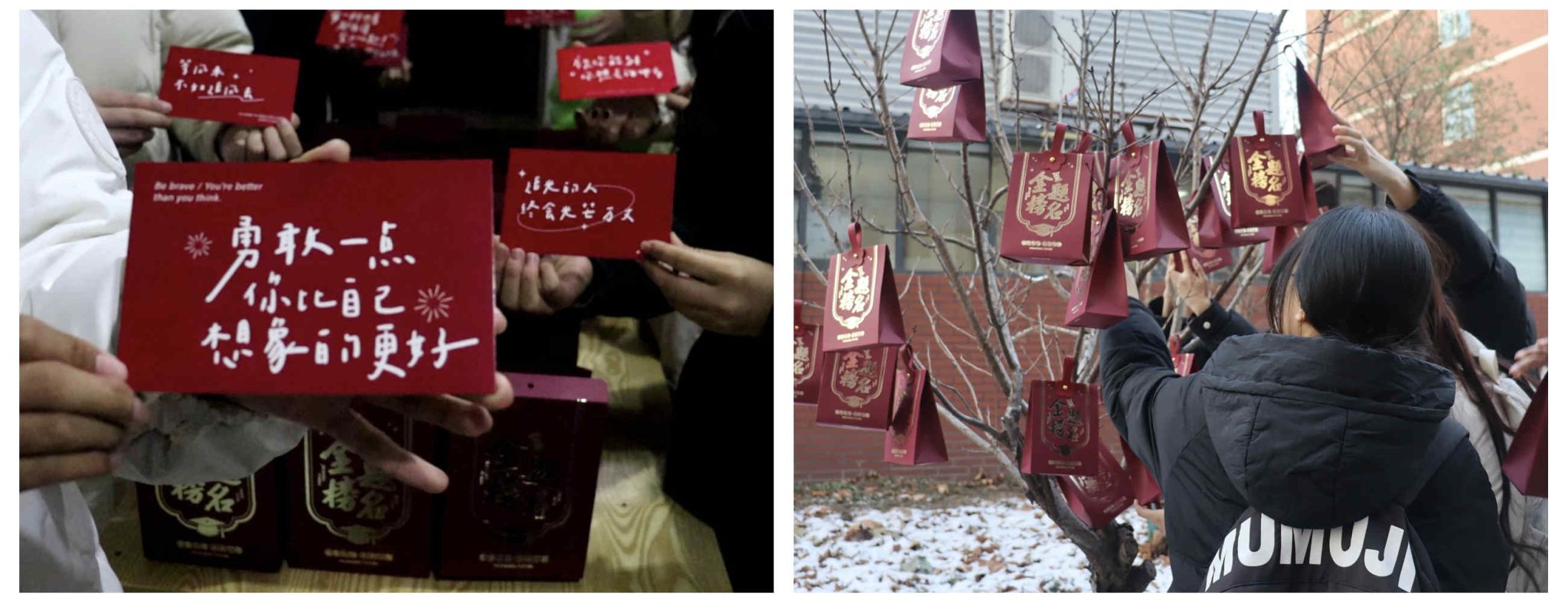 本次活动,学院为每位即将踏上研途的学子精心筹备了一份寓意深远的“考研暖心大礼包”。其中,有蕴含学校治学精神的校徽、书签、钥匙扣,寓意着学子们无论身处何方,母校的牵挂都如影随形;有守护健康的口罩、祈盼胜利的甜蜜糖果,每一份细节都满载着学院对考研学子的深深祝福与无尽鼓励;还有寄托深情厚谊的明信片,学弟学妹们亲手将这份“金榜题名”的祝福送至学长学姐手中,一句句温暖人心的话语,如同冬日暖阳,穿透寒风,直抵心间:“勇者无畏,你比想象中更加强大!”“追光之旅,终将光芒万丈!”“愿你的梦想不息,步履不停。”