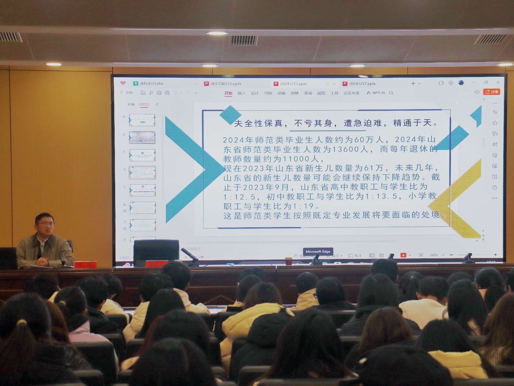 为促进学风建设,浓厚学习氛围,助力学生科学备考,12月12日晚及17日上午,数学学院于章丘校区第二学术报告厅举办“逐梦‘研’途,领航‘编’路”——第十六期大学生讲坛暨“引领未来”活动。此次活动特邀优秀校友滨州市教育局牛军、考研上岸的2024届毕业生程倩倩以及考编上岸的徐誉瑄,与 230 余名 2022、2023 级学生代表深入交流,共话考研考编之路。