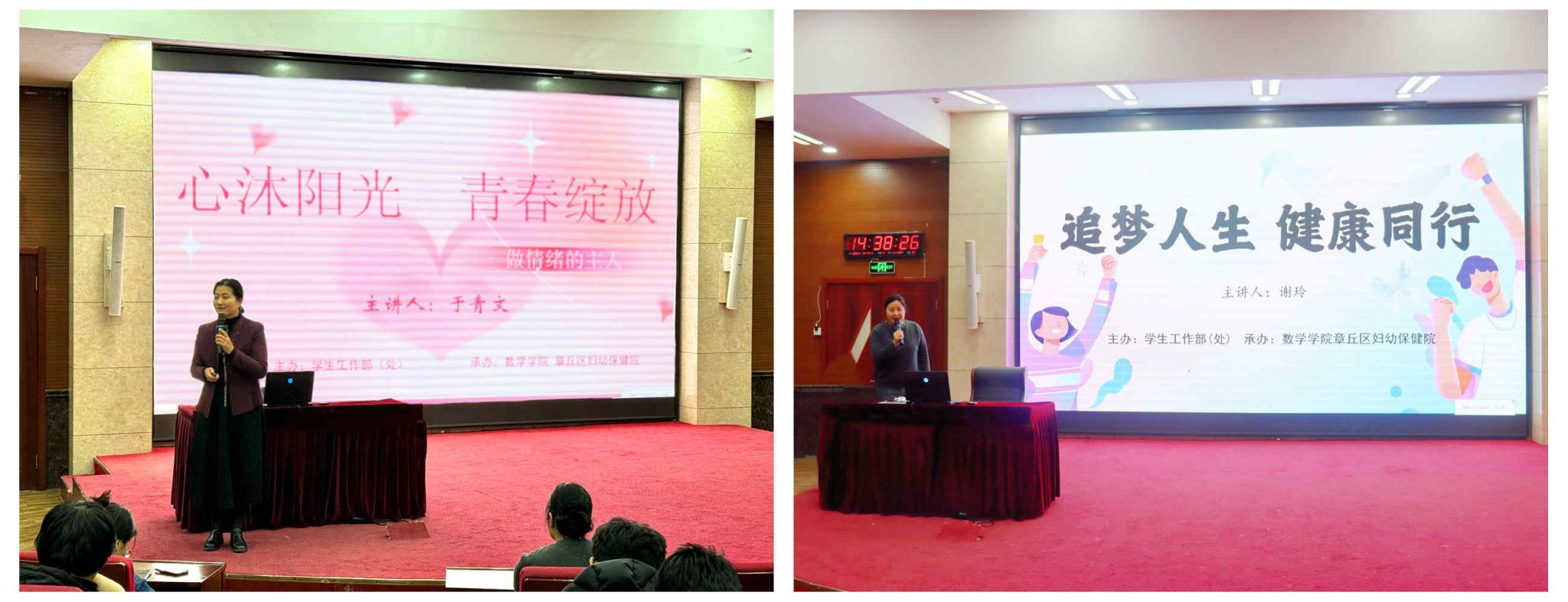为深入贯彻落实学生全面发展理念,引导学生关注自身心灵与身体的成长,营造积极向上、健康和谐的校园氛围,12月24日下午,由学生工作部(处)主办、数学学院承办的以“心沐阳光 青春绽放”为主题的心理健康与青春期生理健康教育专题讲座于章丘校区第一学术报告厅顺利举办。活动特邀章丘区妇幼保健院的两位专家——于青文主任与谢玲主任为主讲嘉宾,围绕情绪管理与青春期生理健康,深入讲解相关知识。